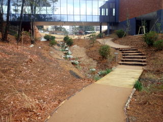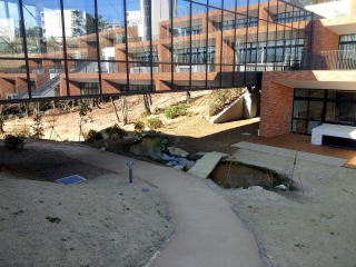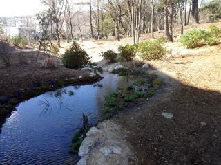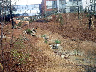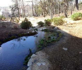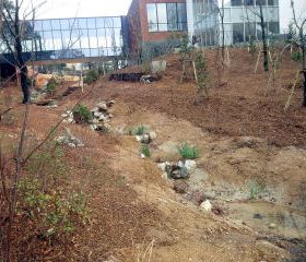 自然の地形を生かしたビオトープの小川は流入部から池まで高低差が7m程あるため、多段落差工(ステップ・プール)を設置して流速を抑え、多様な水生生物が生息しやすい環境を創出しています。