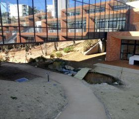 名古屋市の郊外・小幡緑地に隣接する名進研小学校は、校舎の建設にあたり、学校内に残存森林を生かしたビオトープを設けることとしました。