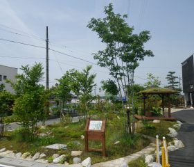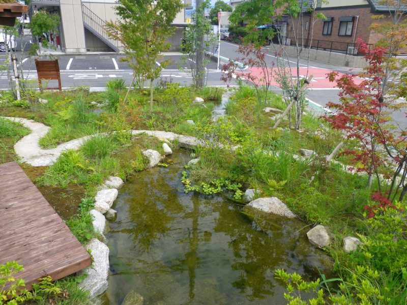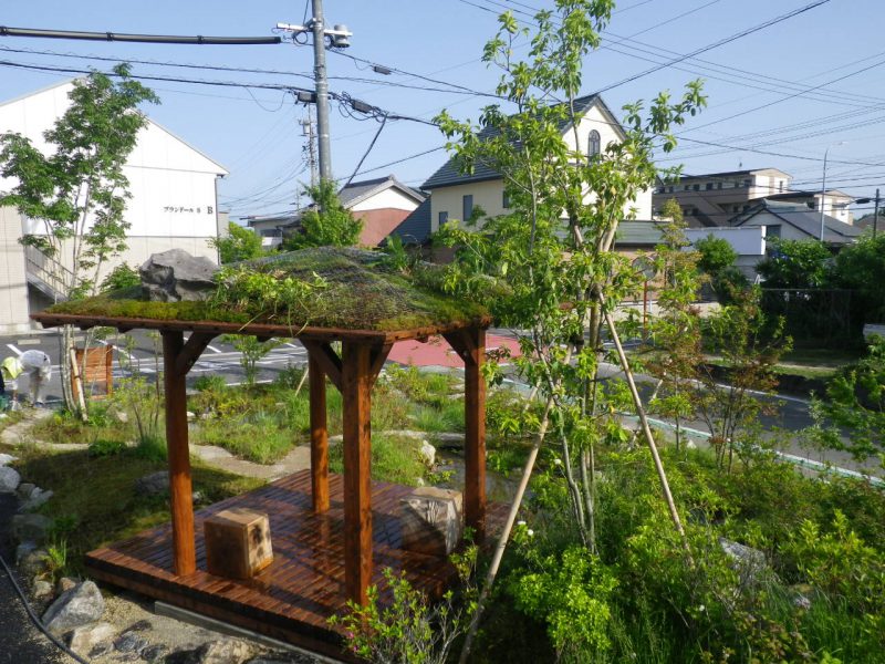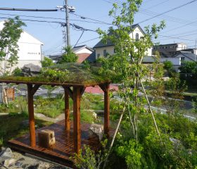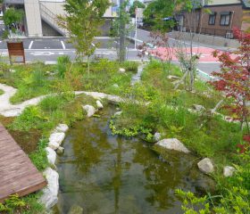 「都市部における生態系ネットワークの拠点づくり」を目指し会社敷地内の一角に設置。会社のある場所が周辺の自然と都市部の中継を担う場所として望ましいところに位置しています。ビオトープの面積としては小さいですが、ネットワークの中継点という意味では大きな役割を担っています。ひとつひとつは小さくてもビオトープを増やし、地域の生態系ネットワークを充実させることが重要です。近隣の方々が、散歩ついでにビオトープを散策してもらい東屋で休憩して頂きます。